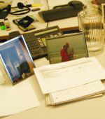 Er ist voll mit Bildern von seiner Familie oder Freunden. Sein Schreibtisch